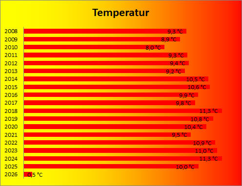 2021 -0,5 °C 2,8 °C 4,8 °C 7,5 °C 11,8 °C 20,5 °C 19,5 °C 17,4 °C 16,0 °C 8,8 °C 3,7 °C 1,9 °C 9,5 °C