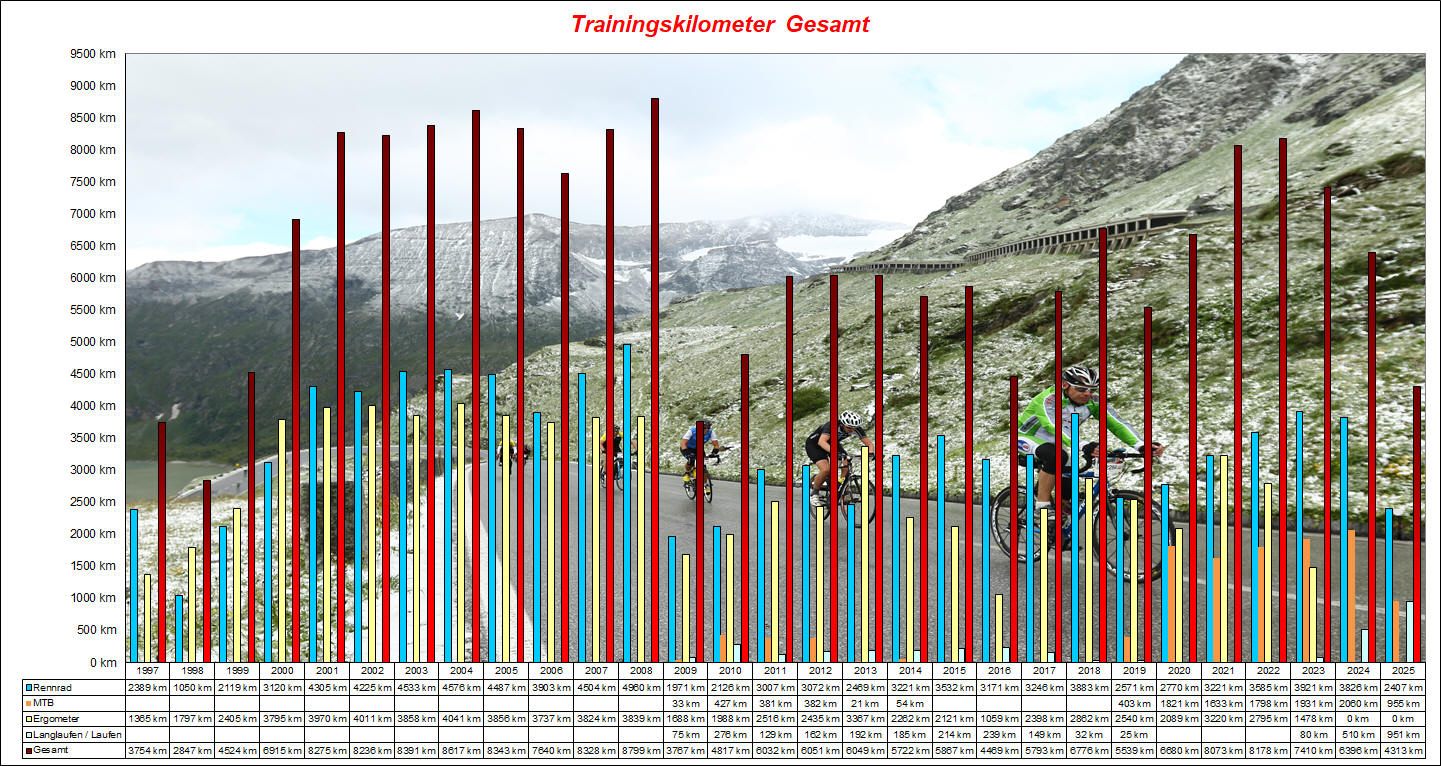 Gesamt 369:59 Std 3405 km 34253hm 2354:22 Std 77577 km 596:08 Std 11949 km 177239hm 3526:50 Std 99392 km 823257hm 6648:15 Std 186601 km 987849hm